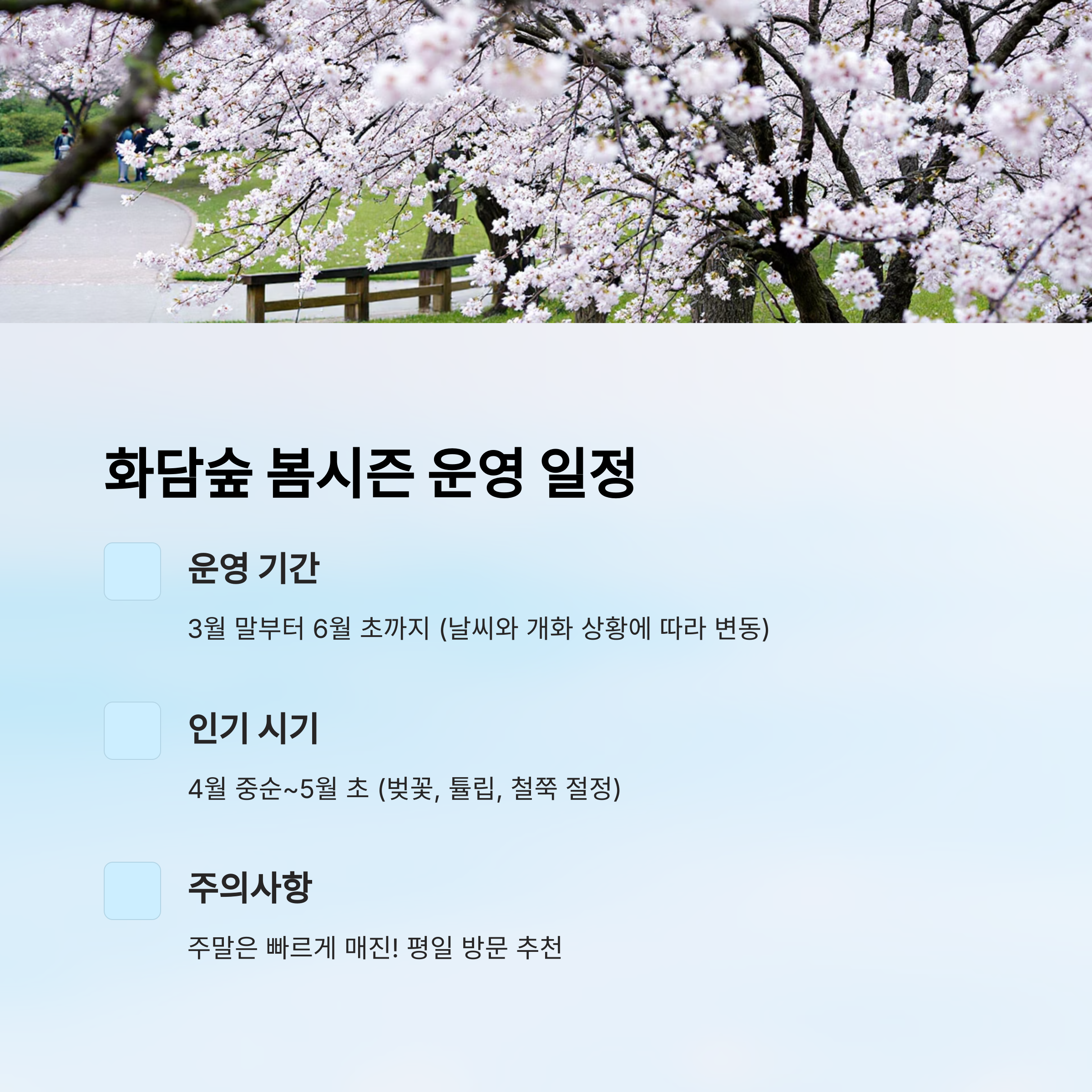 특히 올해는 겨울이 짧고 기온이 평년보다 높을 거라는 기상 예보가 있어서, 벚꽃과 튤립 개화도 예년보다 빨라질 수 있어요. 그러니 3월 중순부터는 일정 확인과 동시에 예매 준비를 시작하는 걸 추천해요.