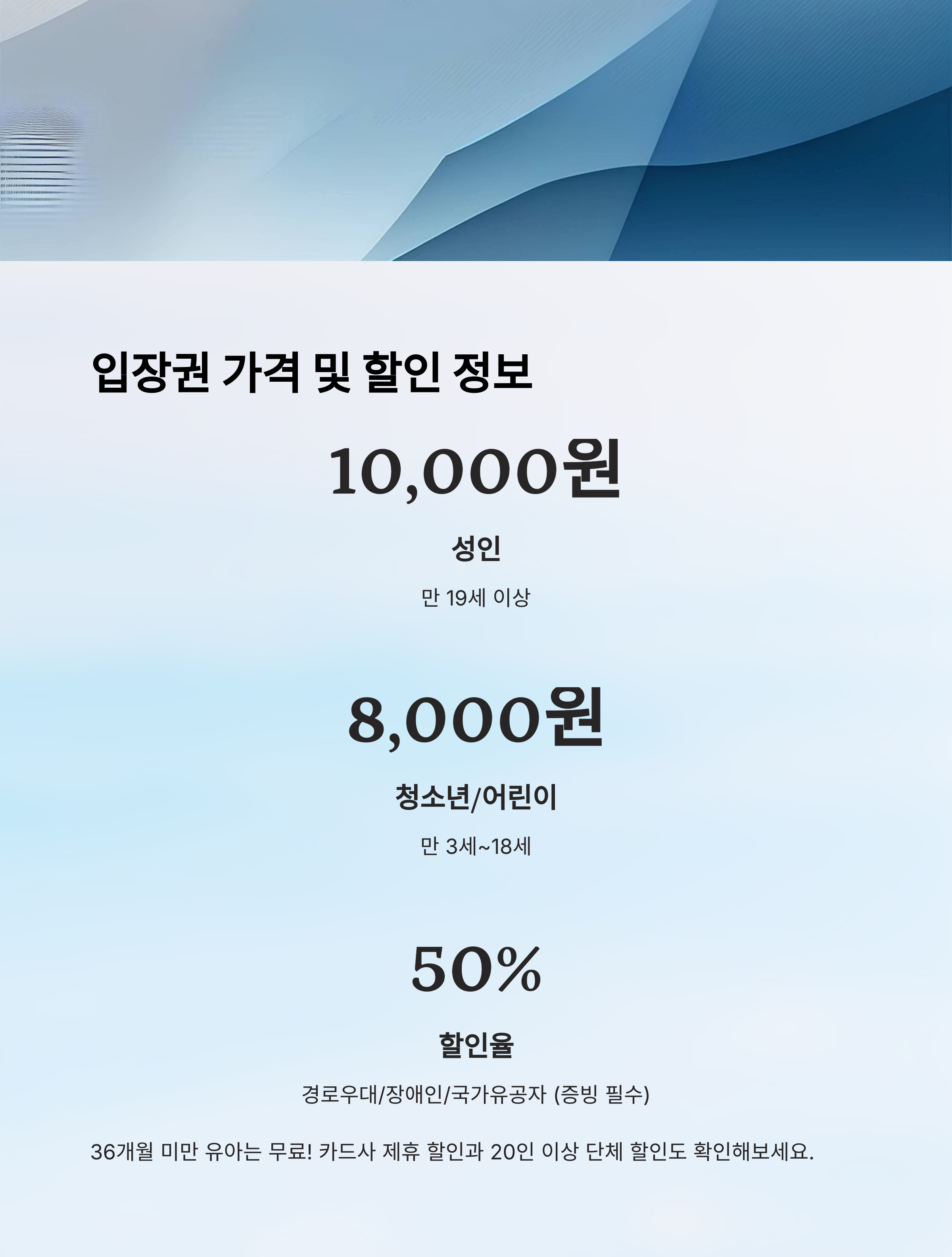 할인 혜택은 방문 당일 증빙자료가 없으면 적용이 안 되니, 관련 서류나 카드는 미리 준비해두는 게 좋아요. 정가도 부담스럽지 않지만, 알뜰하게 즐기려면 제휴카드와 단체 옵션도 잘 활용해보세요💸