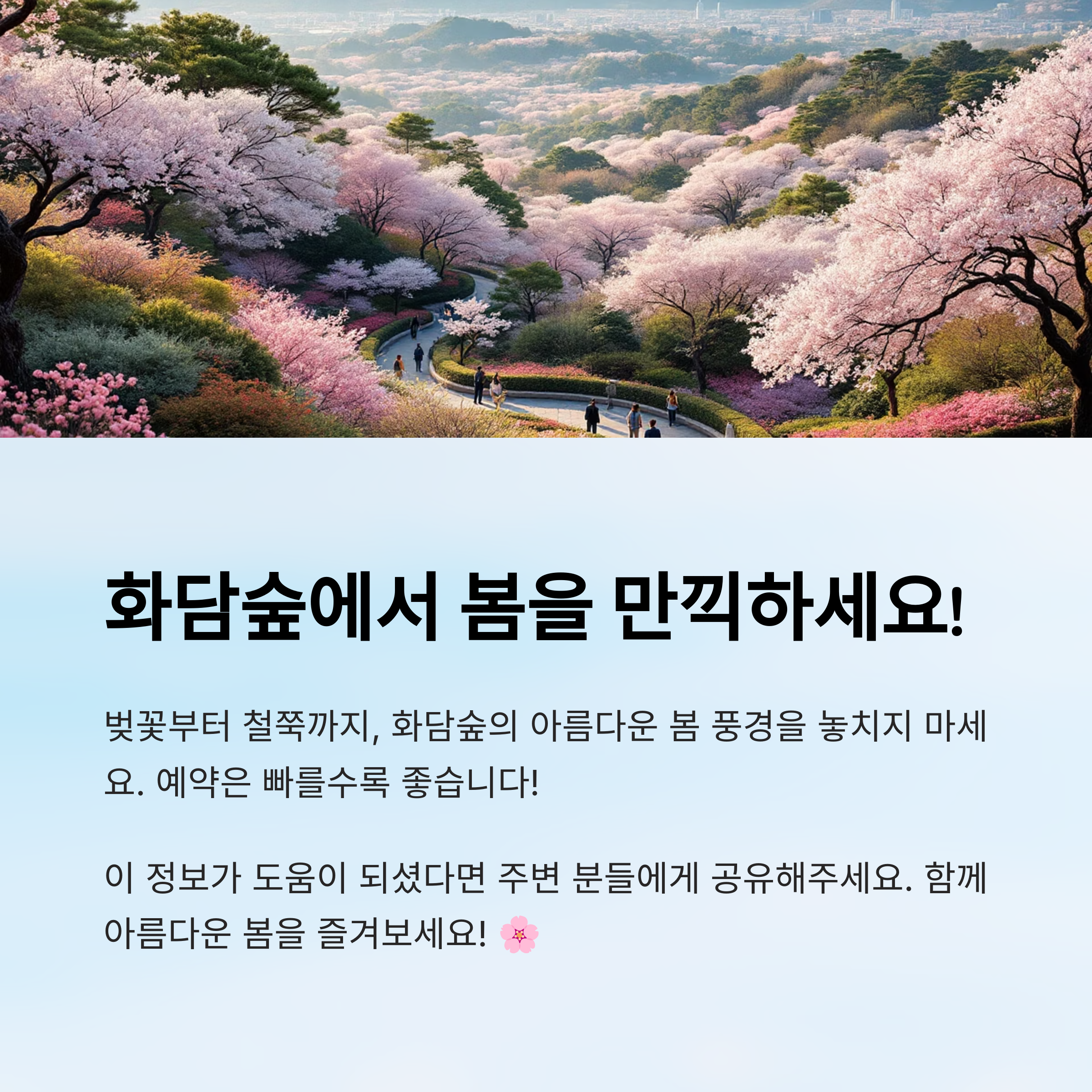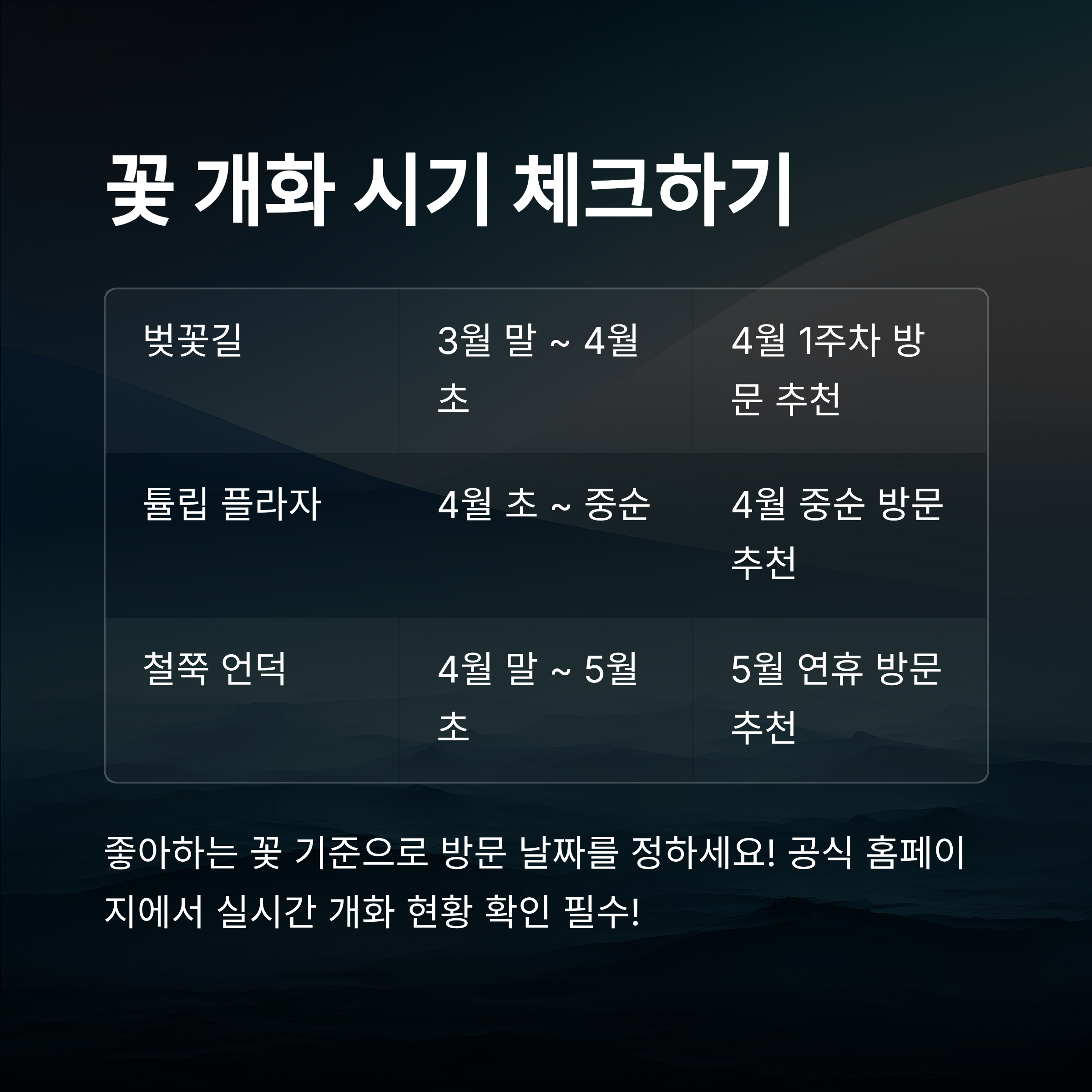 봄꽃 구경은 타이밍이 생명이죠. 그래서 '내가 생각했을 때' 제일 중요한 건 미리미리 움직이는 거예요. 아래 내용을 따라만 해도 멋진 봄나들이가 예약된 셈이에요🌸