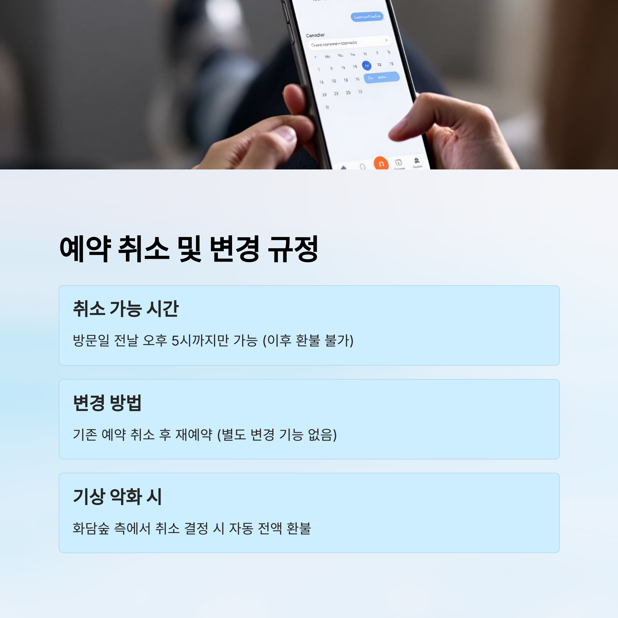 | 변경 방법 | 기존 예약 취소 후 재예약 | 예약 마감 시 재예약 어려움 |