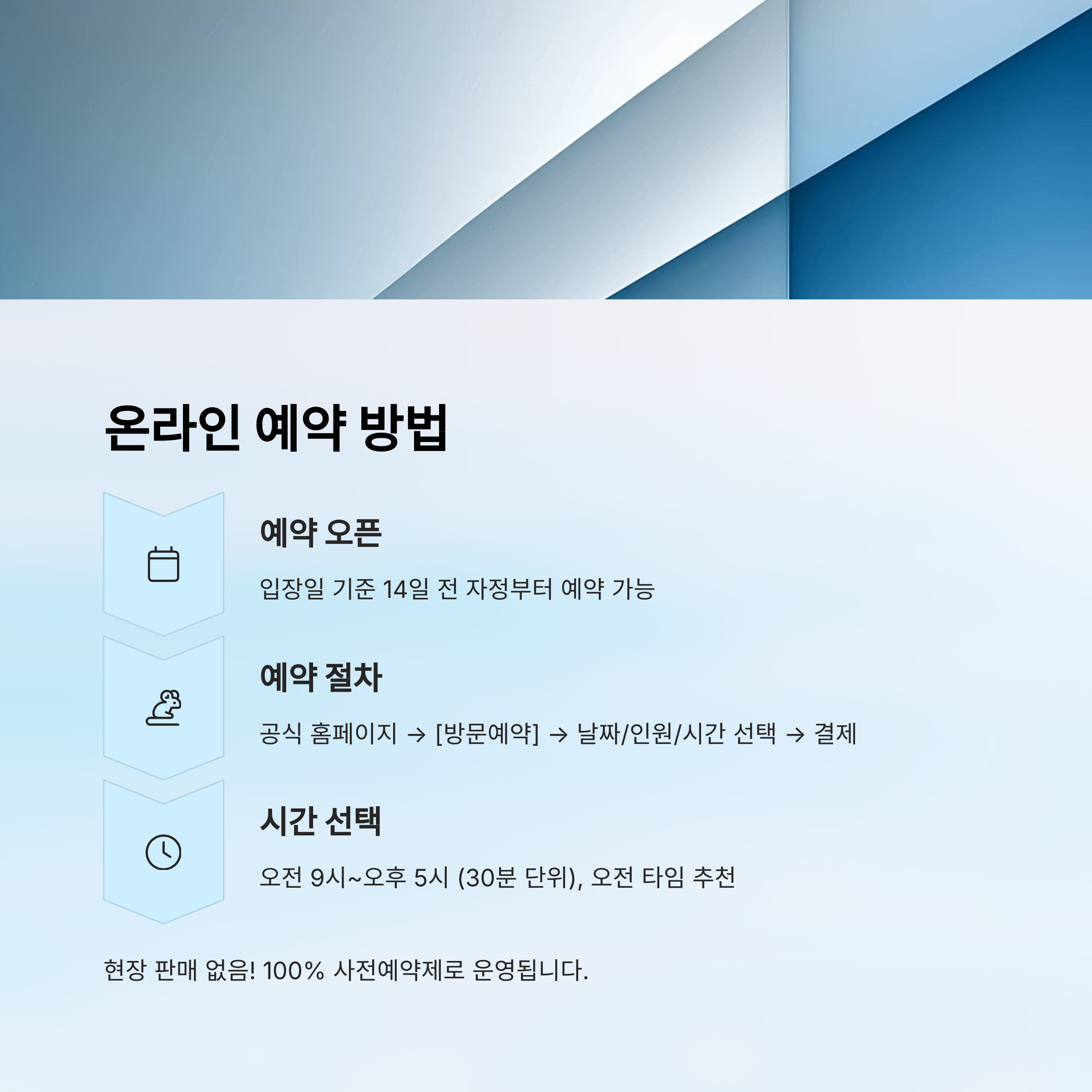 A1. 입장일 기준 14일 전부터 공식 홈페이지에서 예약이 가능해요. 인기 날짜는 자정 오픈 직후 바로 마감되기도 하니 빠르게 움직이는 게 좋아요.
