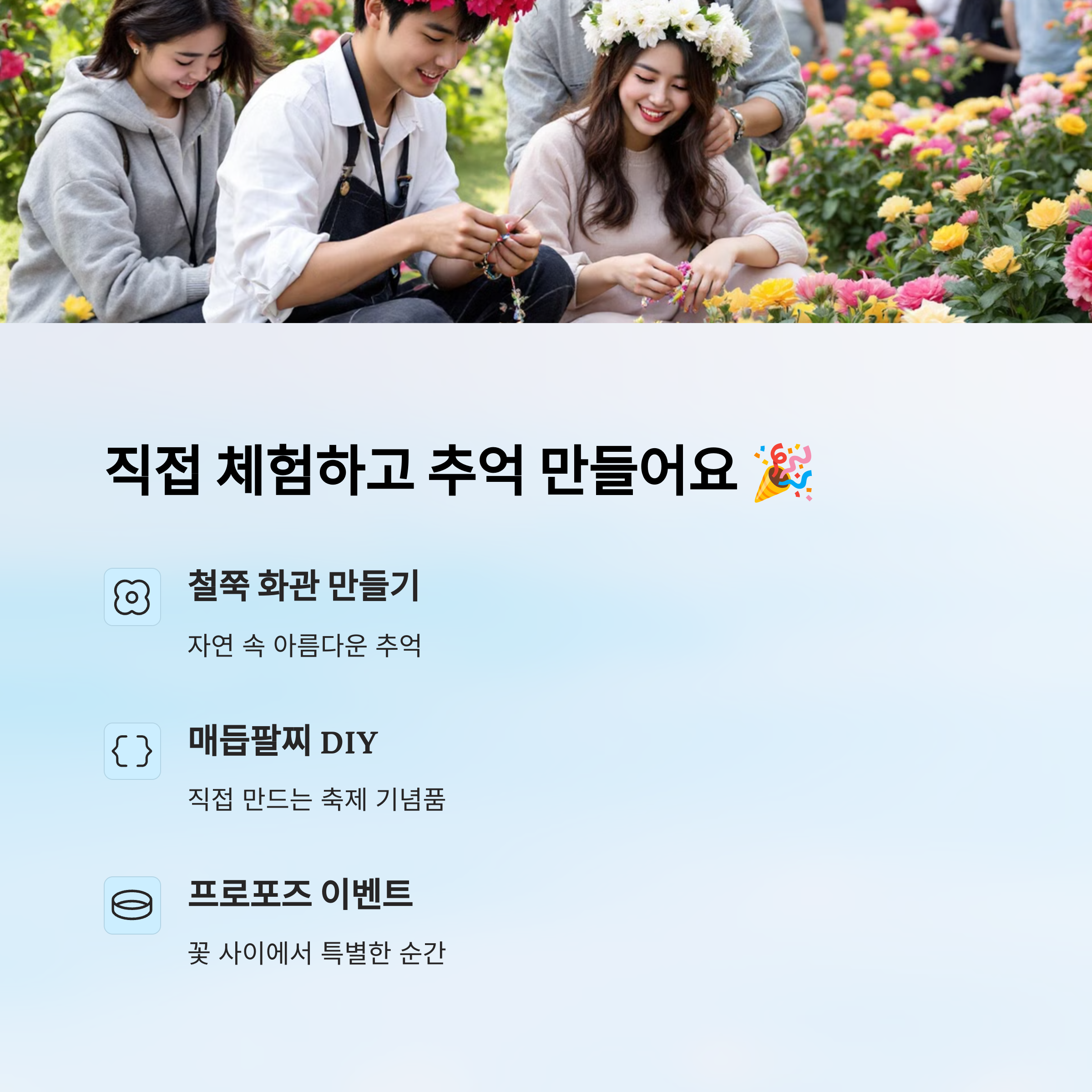 👨👩👧👦 가족 체험 부스 – 철쭉 핀 화분 만들기, 천연 비누 체험, 캐리커처 부스 등 아이와 함께 즐기기 좋아요.