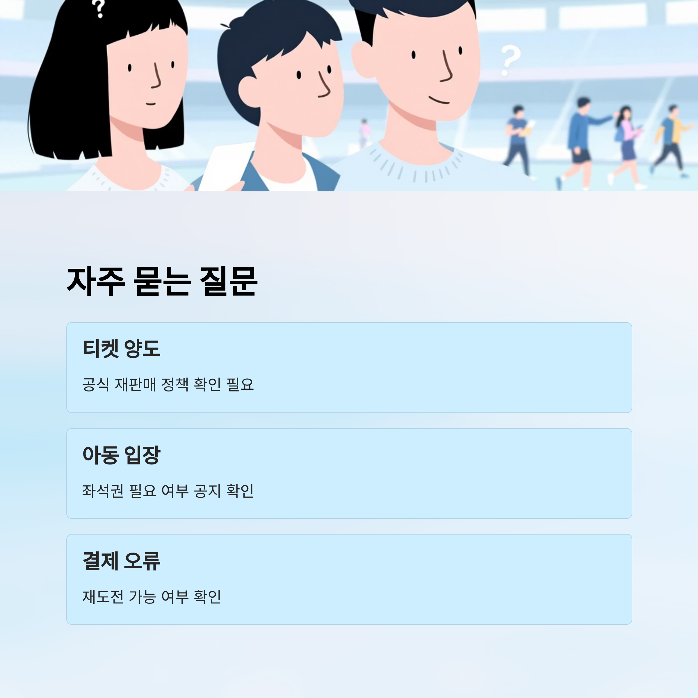A8. 중앙 일반석이나 S석이 가족 관람에 추천돼요. 응원석은 조금 시끄러울 수 있어요!