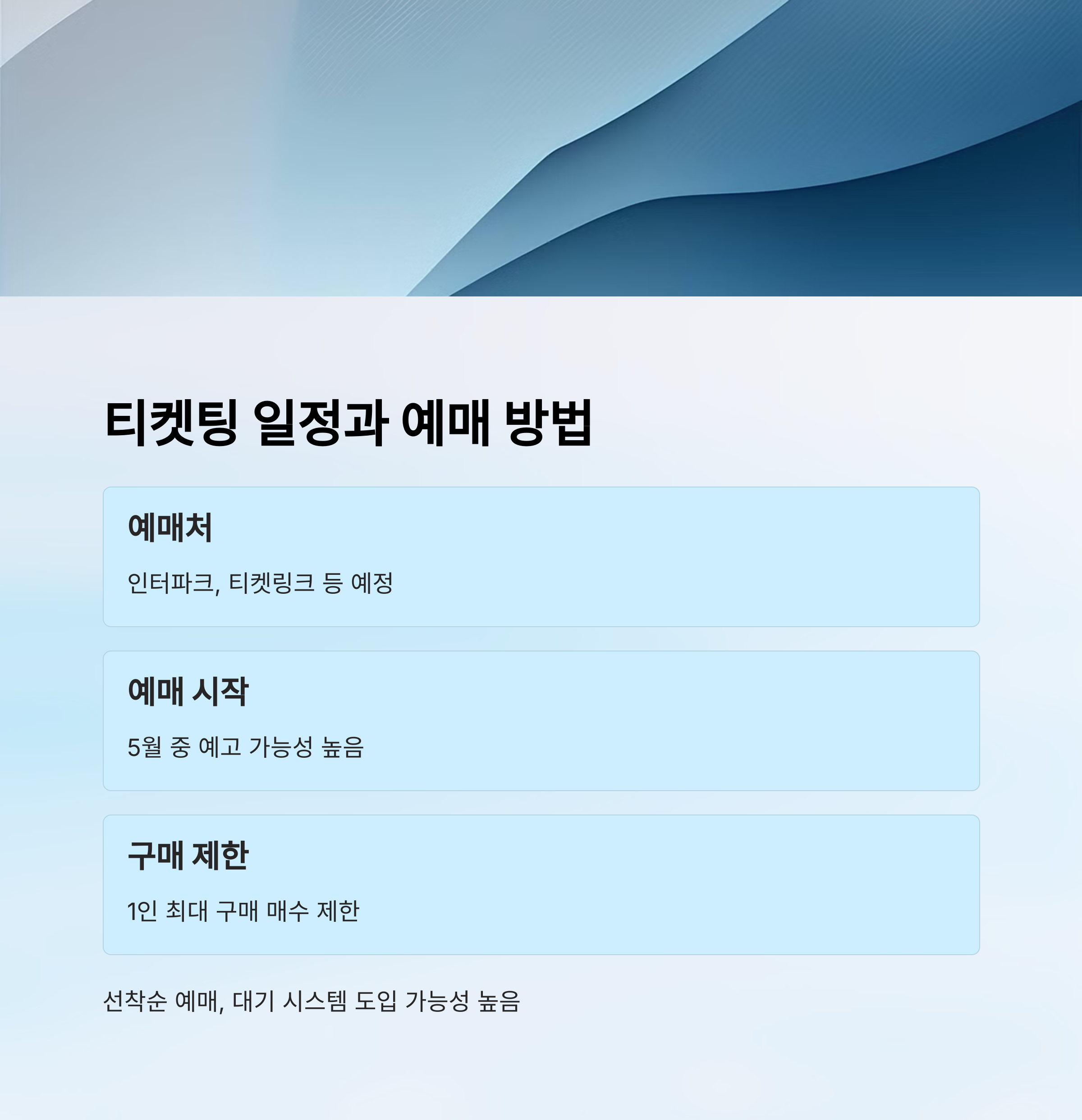 현재 티켓팅 일정은 공식적으로 5월 중순경 발표될 예정이에요. 예매는 6월 초~중순부터 본격적으로 시작될 가능성이 크다고 해요. 지금부터 미리 준비하는 게 핵심이에요!