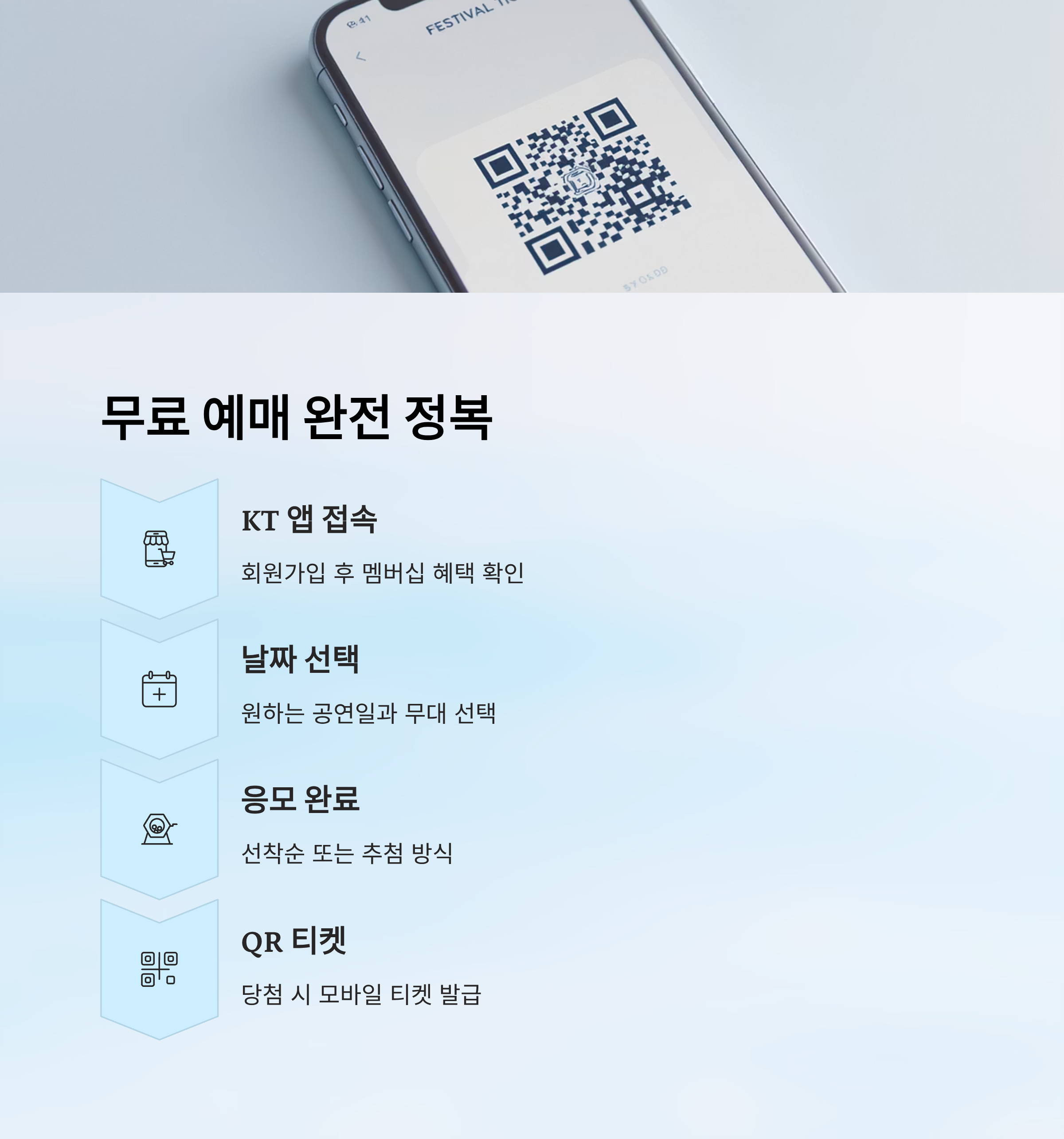 무료 예매는 주로 공식 홈페이지와 KT 전용 앱을 통해 진행돼요. 회원 가입 후 원하는 날짜와 무대를 선택하면 자동으로 응모되며, 당첨 시 문자 또는 앱 알림으로 티켓을 받을 수 있답니다. 예매가 시작되면 몇 분 만에 마감되는 경우도 많으니, 알림을 설정해 두는 것이 좋아요.