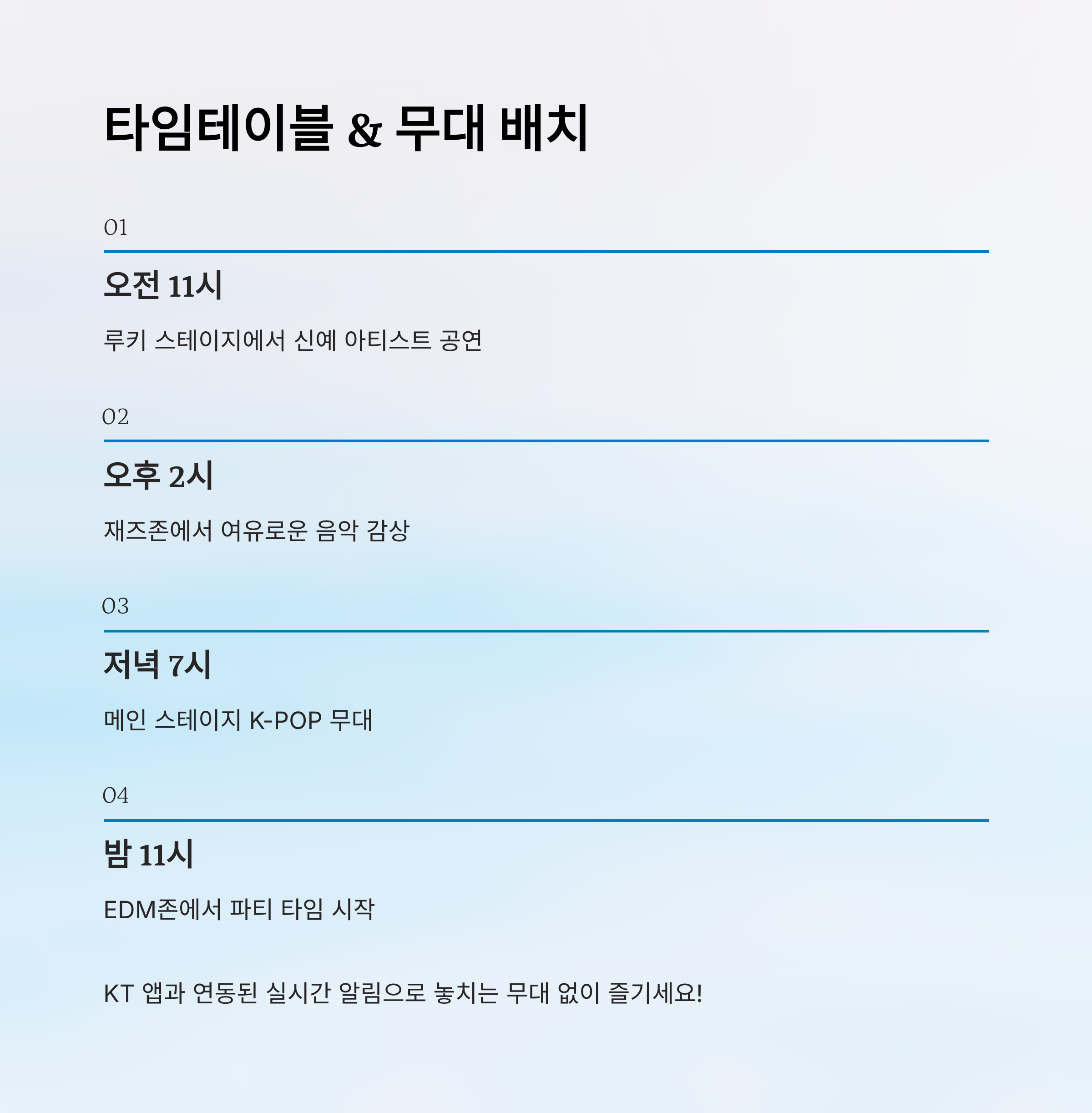 특히 올해는 타임테이블이 KT 앱과 연동되어, 실시간으로 공연 정보를 확인할 수 있어요. 앱에서 나만의 공연 스케줄을 설정하면, 시작 전에 알림을 받을 수 있어서 놓치는 무대가 없답니다. 공연장이 넓은 자라섬에서는 꼭 필요한 기능이라 관객들에게 큰 호응을 얻고 있어요.