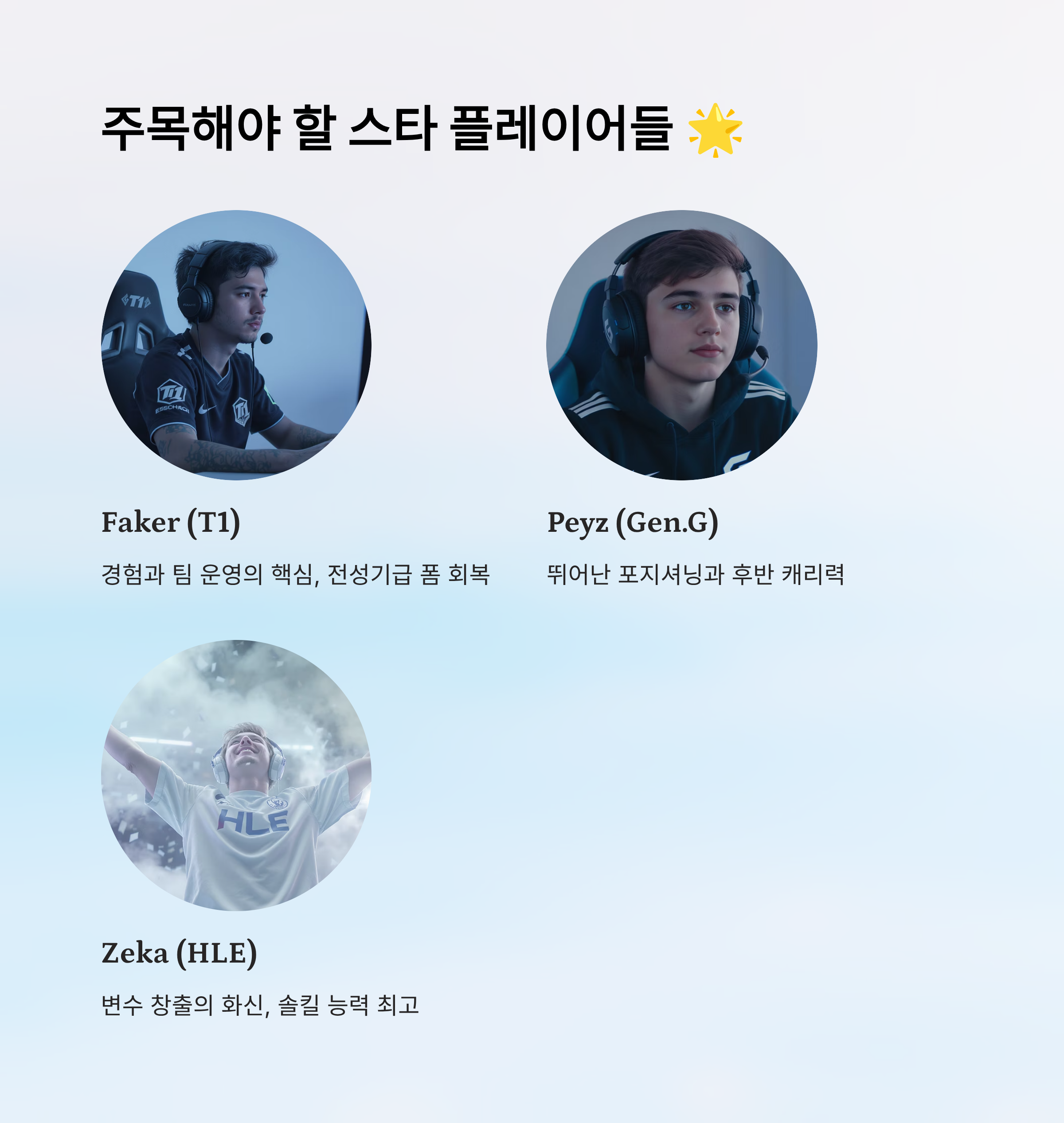 | RapidStar | 후반 운영, 메타 적응 | Gen.G | 탑 변수 | 밴픽 유연성 강조 |
