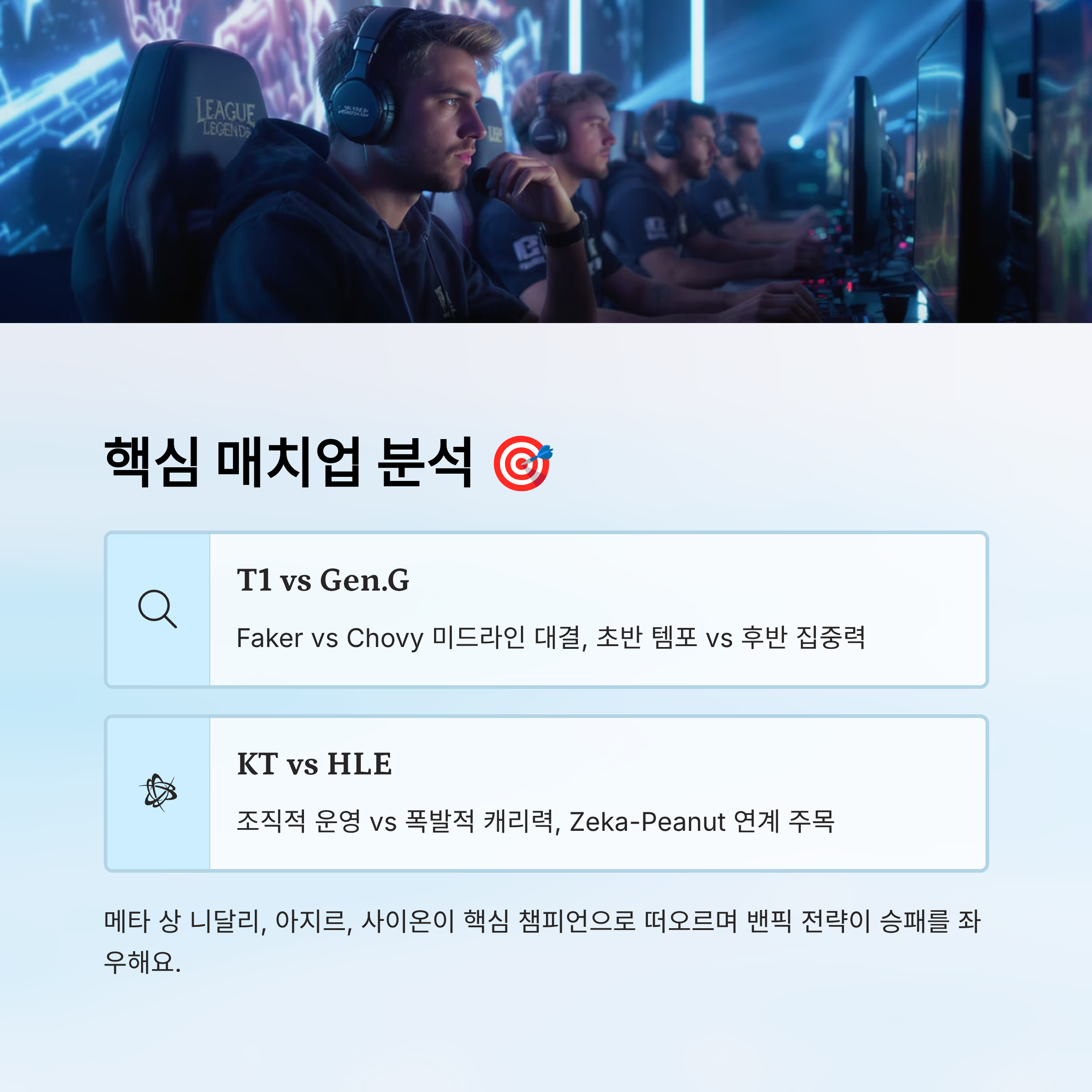 | T1 | 초중반 템포 운영 | 미드, 정글 | Faker, Oner | 후반 집중력 약세 |