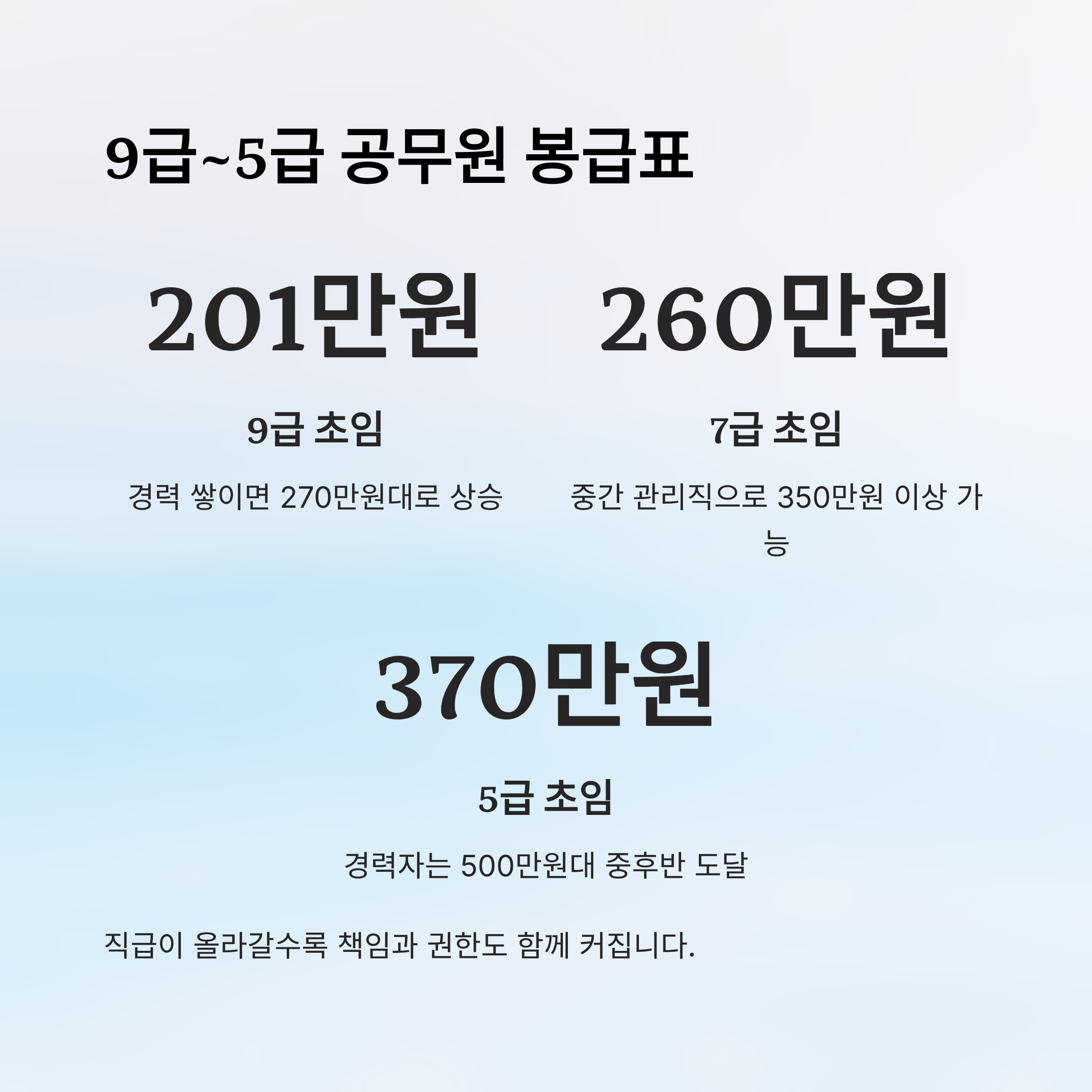 | 7급 | 약 260만 원 | 330만 원대 | 380만 원+ | 중간 관리직 |