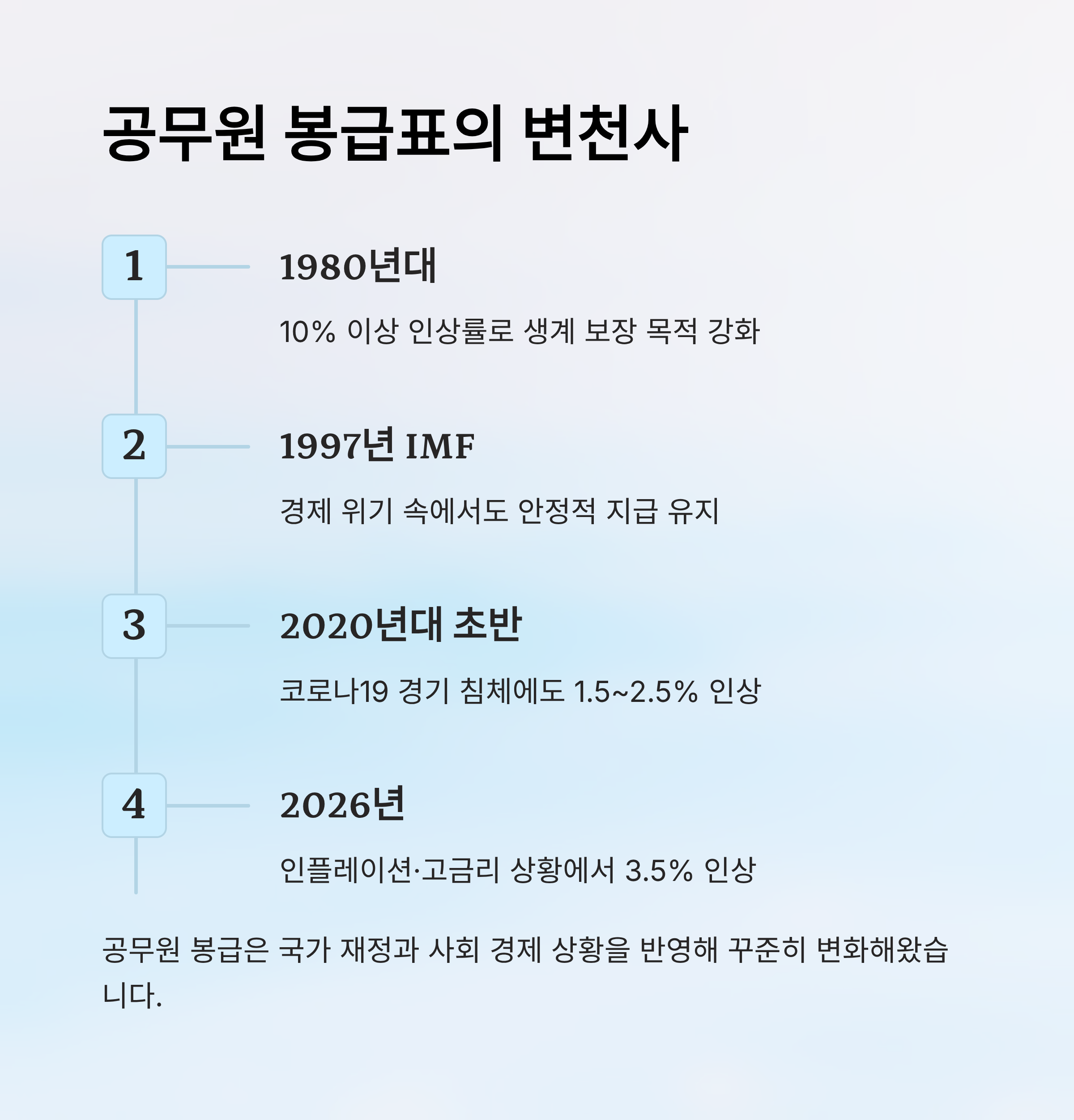 2026년 봉급 인상은 과거와 달리 사회적 합의 과정에서 복지 확대, 청년 지원, 노동 환경 개선이 동시에 고려된 결과예요. 역사적으로 볼 때 이번 인상은 단순한 금액 조정이 아니라 공직 사회의 가치와 사명감을 재조명하는 계기가 될 수도 있어요. 그래서 많은 사람들이 이번 인상을 단순한 월급 인상 이상의 의미로 받아들이고 있답니다.