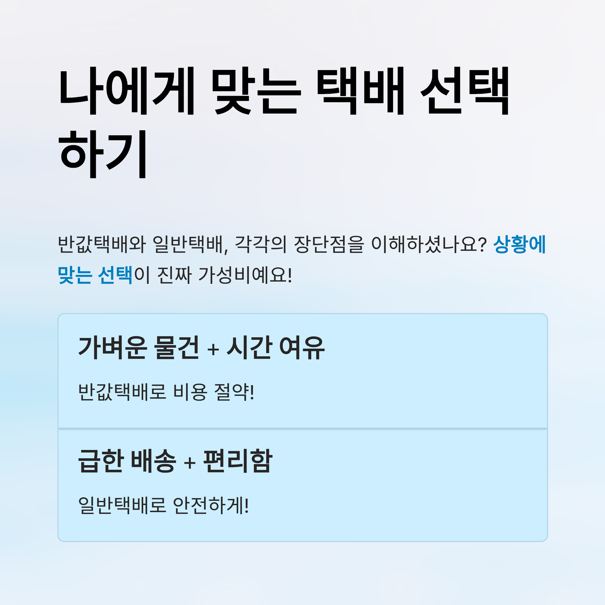 시간이 촉박하거나 급히 보내야 할 물건이라면 일반택배가 확실히 유리해요. 여유가 있는 물건이라면 반값택배로 절약해도 좋고요. 상황에 따라 선택해보세요! ⏳