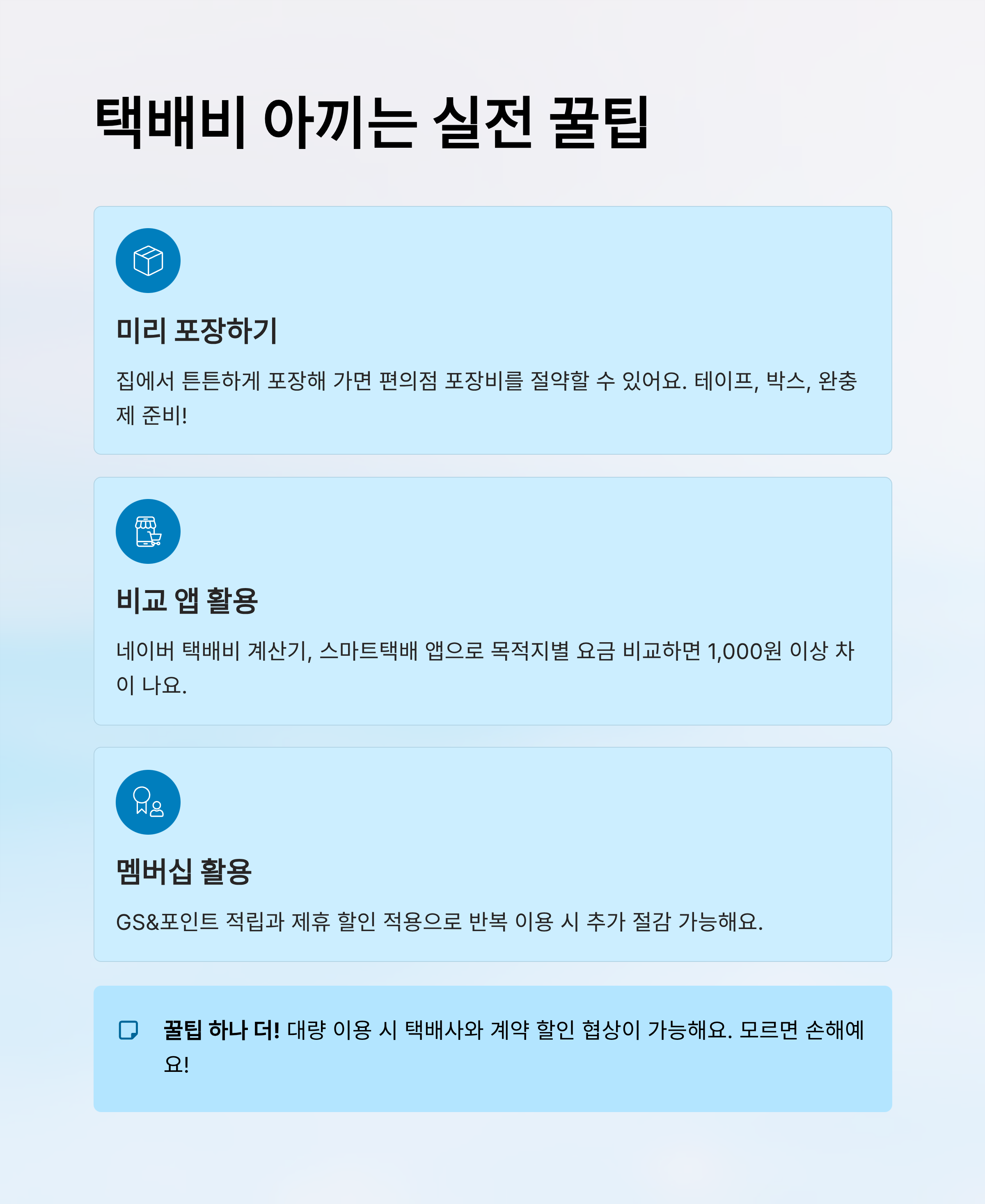 세 번째는 '반복 이용 시 멤버십 활용하기'예요. GS반값택배는 GS&포인트로 적립이 가능하고, 일반택배사도 대량 이용 시 계약 할인이나 제휴 할인 적용이 가능해요. 모르면 손해예요. 🧾