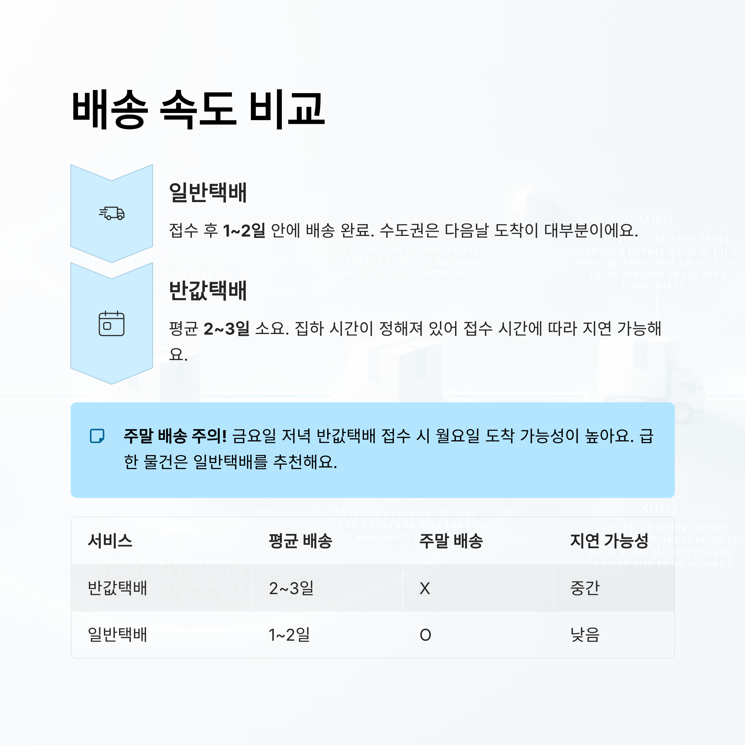 반면, 반값택배는 편의점 집하 시간이 정해져 있어서 접수 시간이 늦으면 실제 배송 시작이 다음날로 밀리기도 해요. 평균 2~3일 정도 소요되며, 주말이나 공휴일 전에는 더 늦어질 수 있어요.
