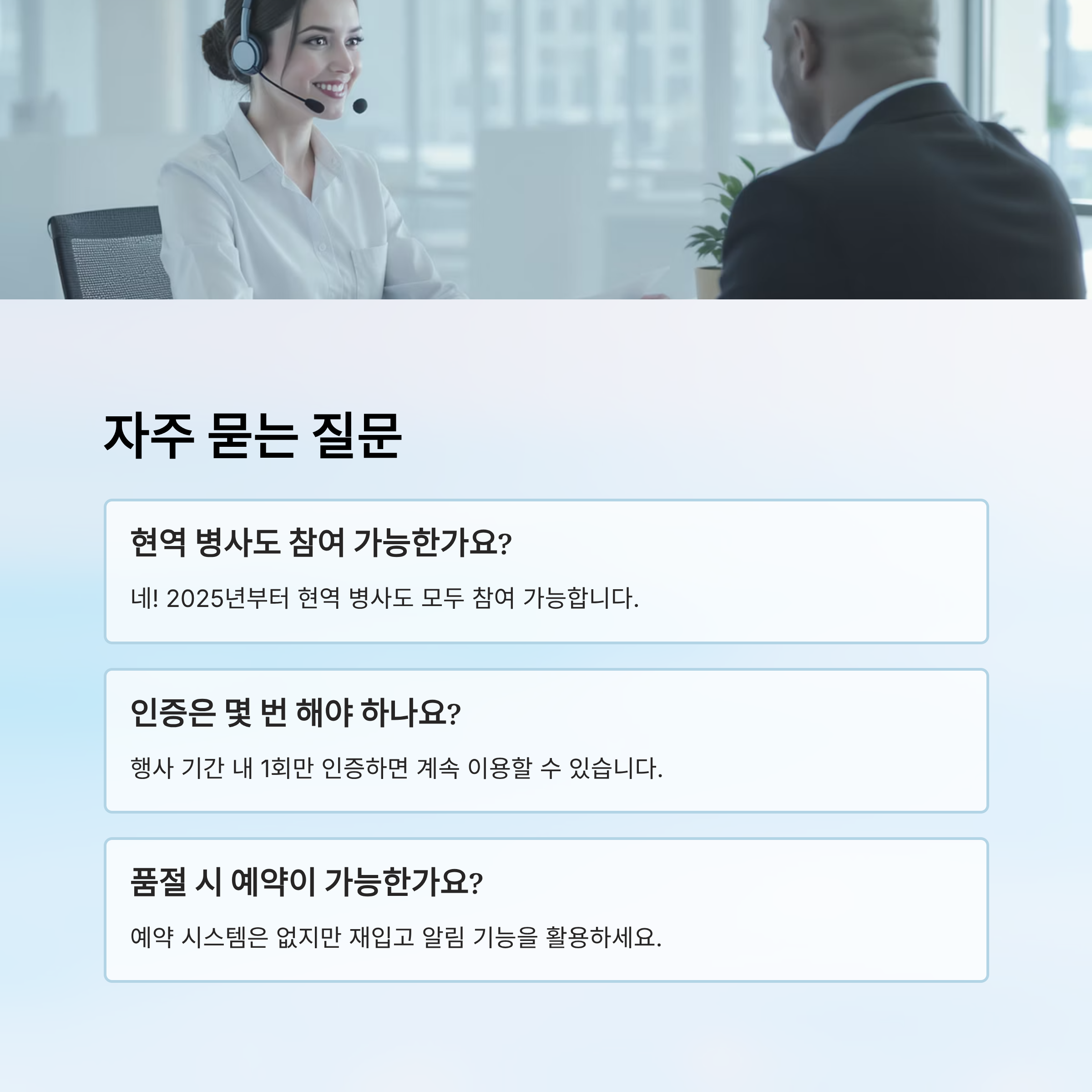 A1. 네! 2025년부터는 현역 병사도 대상에 포함돼요. 군 간부뿐 아니라 일반 병사도 모두 참여 가능해요.