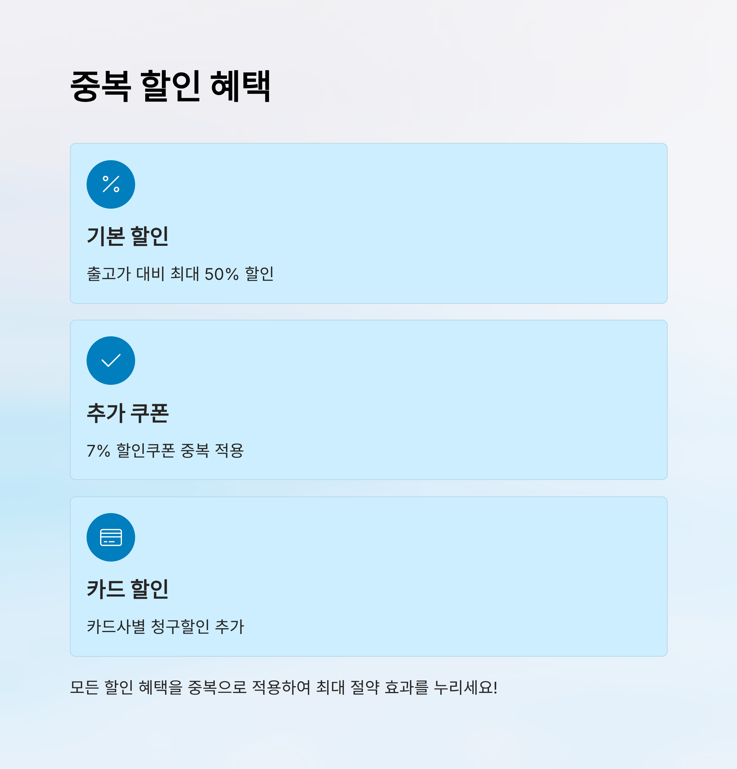 또 하나 중요한 점! 할인 쿠폰이나 카드 청구 할인 혜택은 결제 단계에서 직접 체크하고 적용해야 해요. 실수로 적용 안 하고 결제하면 나중에 소급 적용이 안 돼요.