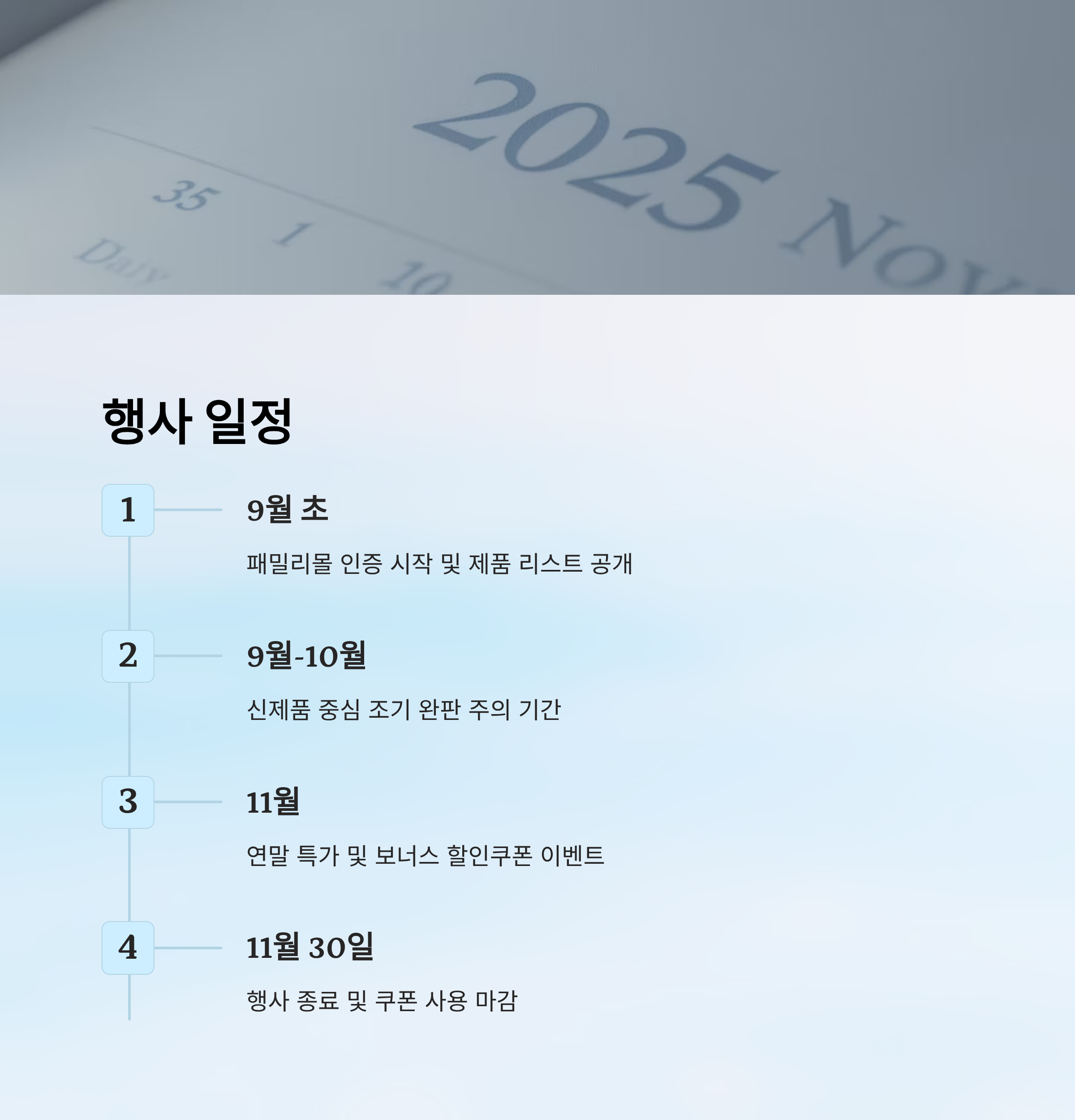 - 9월 초: 패밀리몰 인증 시작 및 제품 리스트 공개