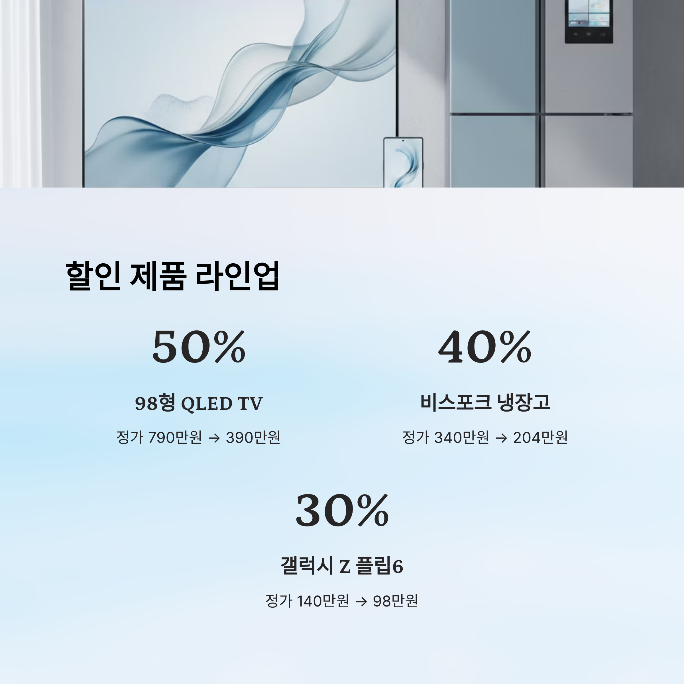 할인 품목도 화려해요. 🖥️ 98형 QLED TV, 🧊 비스포크 AI 냉장고, 📱갤럭시 스마트폰까지 인기 제품이 대거 포함돼 있고, 한정 수량이기 때문에 서두르는 것이 좋아요.
