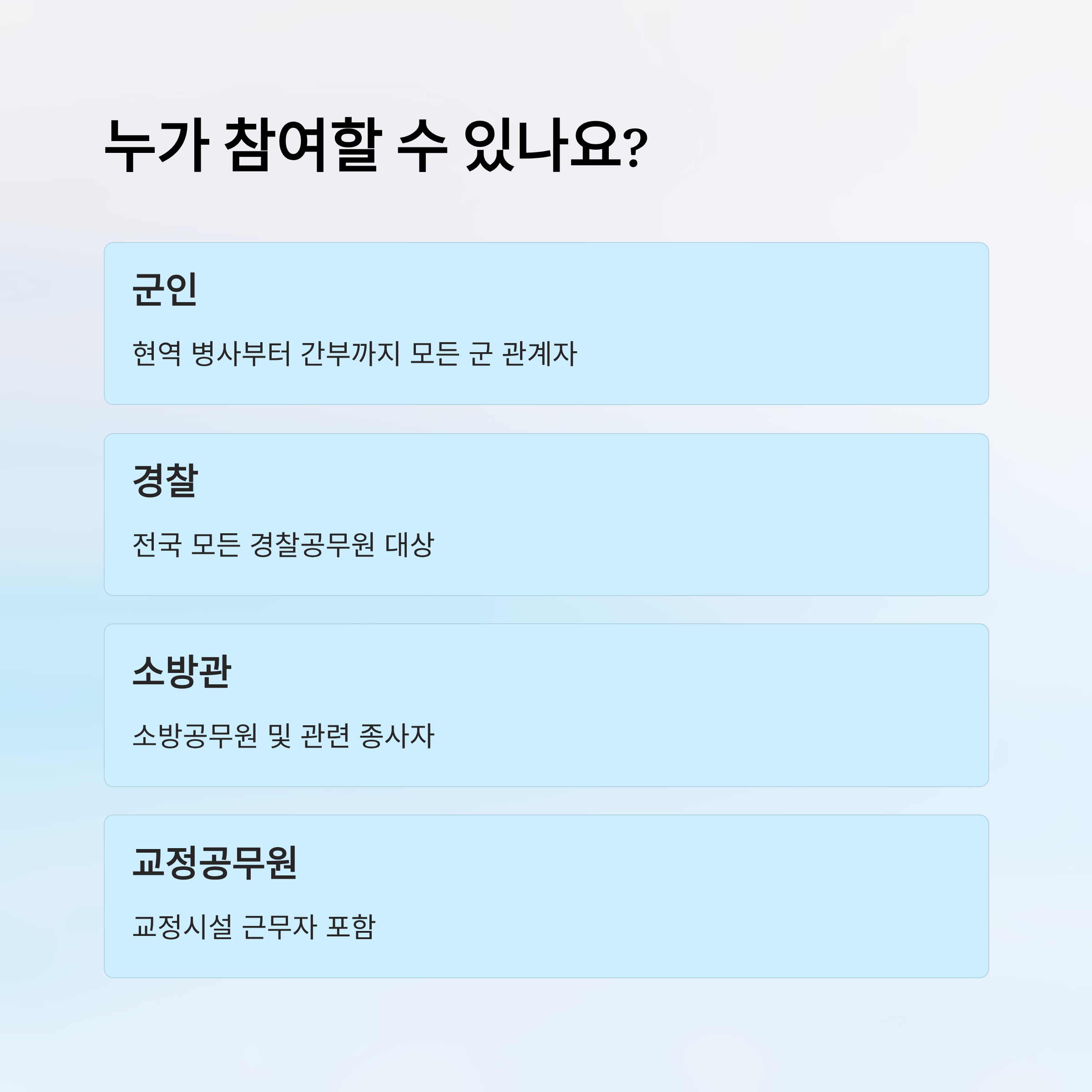 이번 행사에 참여할 수 있는 분들은 생각보다 넓어요. 기존의 군 간부뿐 아니라 현역 병사도 포함되고, 경찰, 소방관, 교정 공무원도 전부 대상이에요. 진짜 고생하시는 분들을 위한 행사라는 느낌이 들어서 더욱 반갑더라고요.